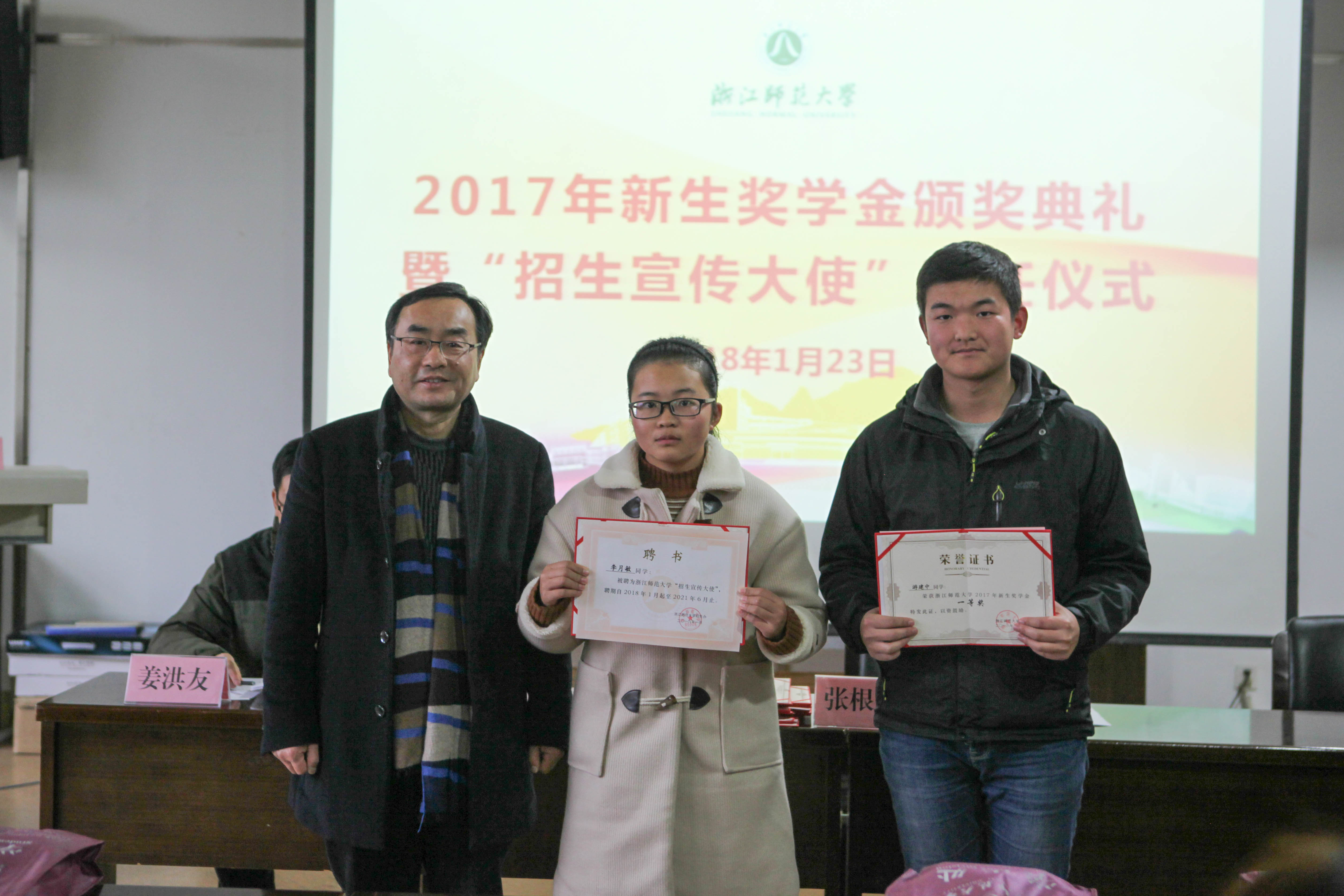 1月23日,我校2017级新生奖学金颁奖典礼暨招生宣传大使聘任仪式在大学生活动中心二楼会议室举行。根据学校新生奖学金评定办法,今年共有来自12个学院的54名新生获得一、二、三等新生奖学金,同时被聘任为浙江师范大学“招生宣传大使”。