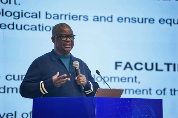 非洲大学协会秘书长奥卢索拉·奥耶沃勒在主旨报告中进一步深化了中非合作愿景。他强调,非洲拥有丰富的自然资源和青年人才潜力,正积极迎接人工智能时代带来的机遇。奥耶沃勒指出,中非双方基于相似的发展需求和坚实的互补优势,开展合作是推动非洲现代化进程的关键举措。他特别强调教师专业发展在合作中的核心地位,表示非洲需要培养掌握数字能力、探究式学习与项目式学习等现代教学方法的专业化教师队伍。面向未来,奥耶沃勒呼吁中非双方通过跨境培训等务实合作项目,共同提升非洲教师队伍的专业素养与教学能力。