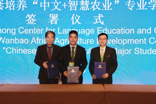 浙师大校长邱利民代表学校与教育部语合中心、万宝非洲农业发展有限公司共同签署协议。图片来源 国际处