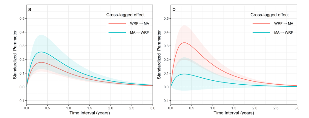 图2 一年级(a)和三年级儿童(b)语素意识与读词流畅性间交互关系随时间变化的轨迹。95%置信区间用阴影表示。MA=语素意识; WRF=读词流畅性