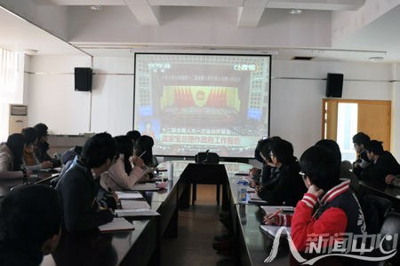 在大学生活动中心二楼,同学们聚精会神看着电视上的两会实况直播,还不时作着记录。在行知学院7楼会议室,老师们也是有组织地收看总理作政府工作报告。