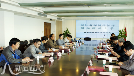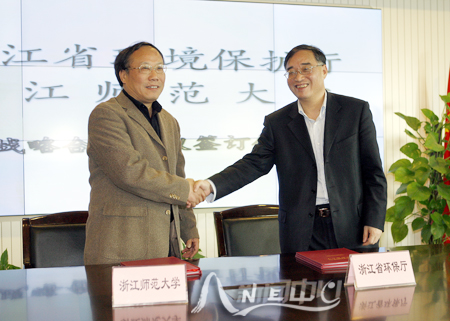 省环保厅科技与合作处处长周碧河、污防处处长喻志钢,省环科院院长杨斌,省监测中心主任吴斌,金华市环保局长丁政,我校校办、科技处、人事处、地理环境学院相关负责人参加签约仪式。