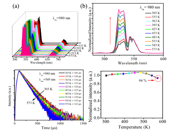 课题组利用高温固相法成功制备了Yb3+,Er3+掺杂的双钙钛矿型Ca2MgWO6荧光粉。对Ca2MgWO6:Er3+,Yb3+荧光粉的结构、形貌和发光性能进行了详细的研究。在980 nm激光激发下,所有Er3+离子掺杂荧光粉都存在531、549和661 nm三个强烈上转换发射。当加入敏化剂Yb3+离子后Er3+离子的UC发射强度约增强了102倍。同时,在单一发光中心(Er3+)里实现了三种不同模式的光学温度测量。这三种温度测量模式包括Er3+离子热耦合能级(2H11/2/4S3/2)的荧光强度比测温、非热耦合能级(2H11/2/4F9/2)的荧光强度比测温以及4S3/2能级的荧光寿命测温。它们的最大相对灵敏度分别为0.92% K-1 (303 K)、0.47% K-1 (303 K)和0.11% K-1 (573 K)。并且Ca2MgWO6:Er3+,Yb3+荧光粉具有良好的热稳定性,即使温度达到573 K,整体发光强度仍保持室温下的94%。Ca2MgWO6:Er3+,Yb3+荧光粉的高温度灵敏度和热稳定性等优点决定了它在光学温度测量方面具有潜在的应用前景。项目成果将为今后多模自校准光学温度测量的设计和研究提供一个新的思路。