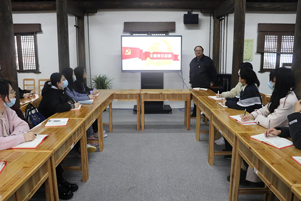 在宣言诵读馆,“双龙学者”杨焕鹏教授首先强调了党史学习教育的重要性,随后就“如何利用地方资源学习、研究‘党史’”这一主题,详细介绍了四种有效的学习和研究党史的方法,即查阅各种文献资料、利用各种文学艺术作品、利用各种有形建筑和充分挖掘民间资源。紧接着,四位学生支部的党员代表结合马克思主义学院“寻访百名党员 传承红色基因”主题活动的阶段性成果,围绕革命时期、建设时期、改革开放时期和新时代四个时期挑选其中的经典人物进行了宣讲。其中,思想政治教育研究生党支部张姝嘉为我们讲述了社会主义新时代“时代楷模”陈立群学长放弃百万年薪、赴贵州黔东南台江县支教的故事,并在最后说道:“希望我们都能像立群学长一样做到‘选择教育,我今生无悔’,将个人的教师梦和国家的教育强国建设紧紧联系在一起。”听完杨教授和四位党员代表的分享后,党员同志们纷纷表示在今后的学习与生活中,要做到学史明理,以史为鉴,胸怀祖国,立足当下。