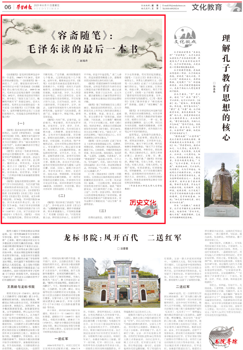 6月11日,《学习时报》刊发人文学院教授赵瑶丹撰写的文章《<容斋随笔>:毛泽东读的最后一本书》。