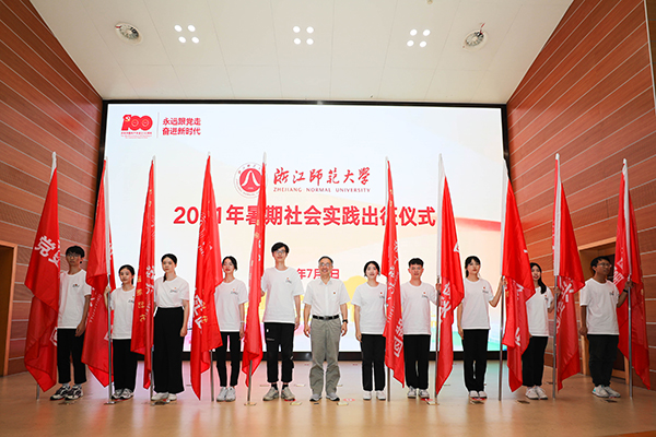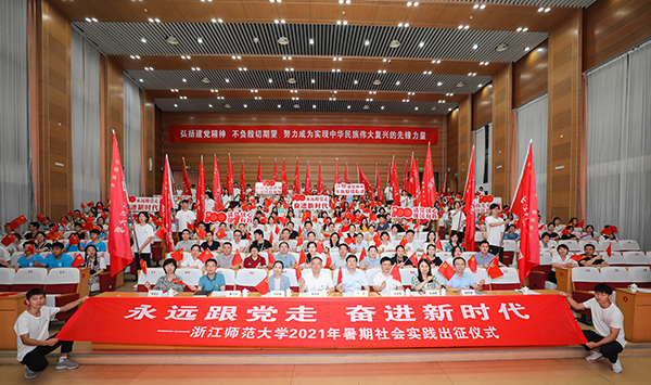 7月3日晚,浙江师范大学2021年暑期社会实践出征仪式在行政中心一楼报告厅举行。浙师大党委书记蒋国俊,党委副书记朱坚,党委委员、组织部、统战部部长吕迎春,党委委员、宣传部、教师工作部部长朱毅峰出席仪式。朱坚主持仪式。