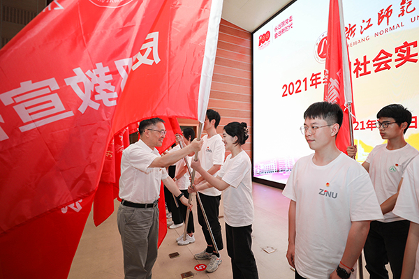 蒋国俊为即将出征的各实践团队学生代表授旗。红旗飘扬,青春起航,浙师大2021年暑期社会实践活动至此正式拉开帷幕。