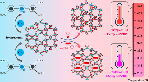 在此之前,课题组在MOF基主-客体复合荧光材料的设计和温度传感方面也取得了重要进展。课题组基于溶剂热法合成了两种具有NbO拓扑的MOFs材料,并通过离子交换反应将具有红光发射的DSM染料和稀土离子Eu3+引入到主体框架得到了两类主-客体材料:DSM@ZJU-56/DSM@ZnPZDDI和Eu3+@ZJU-56/Eu3+@ZnPZDDI,分别研究了它们在生理温区和高温区间的变温荧光性能,并通过变温光谱及荧光寿命分析了两类主客体材料中发光单元间的能量传递过程。其中Eu3+@ZJU-56这一主-客体复合材料显示出超高的相对灵敏度(14.56%·K-1, 453 K)。这一成果为设计新型的主-客体复合荧光传感材料提供了新的思路。该工作“Embedding Red Emitters in the NbO-Type Metal−Organic Frameworks for Highly Sensitive Luminescence Thermometry over Tunable Temperature Range”(2021, 13, 11078; DOI: 10.1021/acsami.1c00635)发表于国际知名期刊ACS Applied Materials & Interfaces (一区TOP,IF=9.229)。