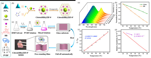 该研究工作通过原位合成反应,将碳点(Cdots)和罗丹明B(RB)两种客体发光单元同步组装至ZIF-8框架内,从而构建了一种新型的双发射纳米复合材料Cdots&RB@ZIF-82。将该纳米粉体材料与聚偏氟乙烯(PVDF)混合,制备了 MOF 基混合基质膜(Mixed-Matrix Membranes, MMMs)材料Cdots&RB@ZIF-82-MMM。薄膜保持了纳米复合材料的温度响应特性,在20到80℃范围内Cdots/RB荧光强度比与温度线性相关,探测灵敏度在20oC为0.74% ℃-1 ;此外,该薄膜温度计具有良好的热稳定性和光谱稳定性,在高湿、水和碱性(pH=12) 条件下均保持稳定;同时,薄膜温度计展示出了良好的柔性和可加工性,可用于弯曲表面等条件下的荧光温度测量。