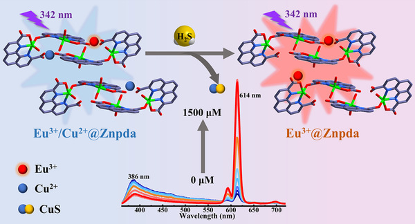 课题组通过溶剂热反应制备了一种结构稳定且富含开放羧酸氧位点的锌基配合物,利用裸露的羧酸氧与Eu3+、Cu2+配位,构筑了具有双发光中心的复合材料Eu3+/Cu2+@Znpda,并研究了该材料对H2S的荧光响应性能,在配合物用于H2S的荧光检测方面也取得了重要进展。研究结果表明Eu3+/Cu2+@Znpda对H2S呈现开启型的荧光响应特性,且具有响应(<1 min)和灵敏度高(1.45 μM)等优点。此外,以配体和Eu3+的荧光强度比作为输出信号,我们设计了用于H2S识别的IMPLICATION逻辑门,为设计用于硫化氢荧光检测的材料提供了研究思路。该工作“Stable Eu3+/Cu2+-Functionalized Supramolecular Zinc(II) Complexes as Fluorescent Probes for Turn-On and Ratiometric Detection of Hydrogen Sulfide”(2021, 13, 20371; DOI: 10.1021/acsami.1c04013)发表于国际知名期刊ACS Applied Materials & Interfaces (一区TOP,IF=9.229)。