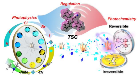 该论文基于三苯基丙烯腈(TPAN)骨架设计了两组具有贯穿空间共轭性质的聚集诱导发光分子,展示了这些荧光材料同时在光物理方面(量子效率、颜色)和光化学方面(光致变色和光激活荧光)中的可控调谐,并且明确打破了传统重原子效应在聚集诱导发光分子的不适用性,详细解释了其内在机制。不同于经典的重原子效应,在这些聚集诱导发光分子中表现出不同寻常的反重原子效应,从而实现了聚集诱导发光分子的高效发光。引入D-A结构,实现了这类分子发光颜色的调制,并且同时实现了分子由光环化引起的可逆光致变色和光环化脱氢引起的不可逆光致变色过程,可以用于多模式高级信息加密。利用该材料多模式信号多重加密性质,团队对浙江师范大学的地理坐标进行了二重加密,并实现了学校缩写“ZJNU”的光信息储存。