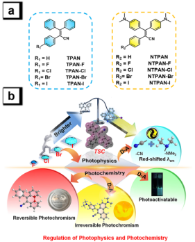 以可控的方式同时调控聚集诱导发光分子的光物理和光化学过程是非常具有挑战性的。如果一类有机分子能同时结合聚集诱导发光(AIE)、光致变色(Photochromism)、光激活荧光(Photoactivatable Fluorescence)三者的性质,这无疑是一种令人向往的“全能”光学材料。