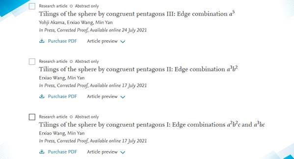 [1] 王二小,严民. Tilings of the Sphere by Congruent Pentagons I, II, III. Adv. Math. (2021), https://doi.org/10.1016/j.aim.2021.107866, 107867, 107881