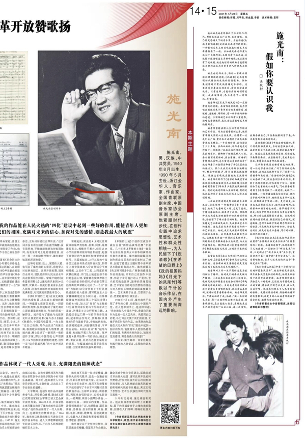 文章以庆祝中国共产党成立100周年文艺演出《伟大征程》为切入,引出演出第三篇章中《在希望的田野上》《假如你要认识我》两首歌的曲作者“人民音乐家”“改革先锋”施光南。文章分成“我急切地想要用音乐来表达这亿万人民所欢庆的胜利”“我力图用歌声和音乐概括中国大地朝气蓬勃的新气象”“如果我的作品能在人民火热的‘四化’建设中起到一些好的作用,能使青年人更加热爱我们的祖国,充满对未来的信心,加深对党的感情,则是我最大的欣慰”“他的作品体现了一代人乐观、向上、充满阳光的精神状态”四个部分,介绍了施光南用生命为祖国祝酒,谱写了一曲曲改革开放赞歌的历程。
