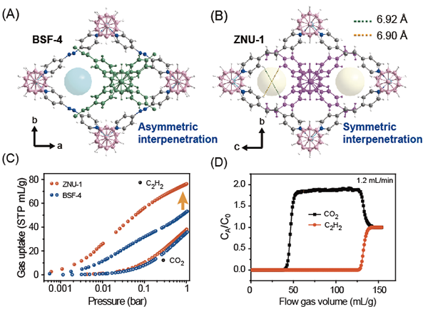在工业上,结构和物化性质相近的化合物的分离具有重要意义也面临巨大挑战。在甲烷氧化偶联制乙炔的过程中,二氧化碳是不可避免的杂质。乙炔和二氧化碳分子具有相近的沸点(189.3 K vs 194.7 K),传统的精馏分离需要大量能耗,而溶剂吸收则会带来二次污染。物理吸附具有能耗低、操作简单等优点,但乙炔和二氧化碳分子具有相同的动力学直径(3.3 Å)和相近的极性,传统吸附材料很难实现乙炔/二氧化碳的高容量高选择性分离。
