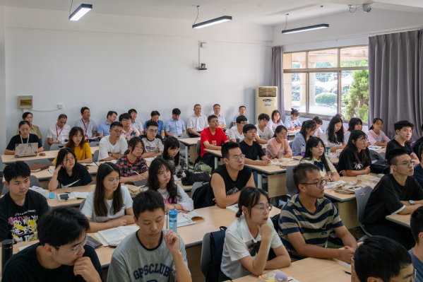 蒋国俊一行首先来到教室,旁听了马克思主义学院肖祥教授主讲的《马克思主义基本原理》课程。从斯芬克斯之谜讲到西西弗斯的故事,从和学生相处的一件小事讲到国际时事,从“哲学与处世修身”到“马克思主义与大学生的‘精神成人’”······肖祥教授用贴近生活的案例和深入浅出的讲述,引导同学们弄清楚为什么要学习哲学,如何运用马克思主义哲学辩证地看待自己、看待历史、看待世界。