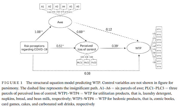 本研究调查了COVID-19风险感知与消费者行为的一个重要组成部分——溢价支付意愿(WTP)之间的关系,并进一步探索了该关系背后的潜在机制。结果表明,对COVID-19风险感知越高的人,越可能对商品具有更高的WTP,该效应可能是由COVID-19引发的敬畏和感知失控驱动的。此外,研究还对享乐型和实用型产品进行比较,发现无论是享乐型还是实用型产品,COVID-19风险感知都是通过了敬畏和感知失控对它们产生了影响。本研究为探索突发公共卫生事件对公众消费的影响做出了重要贡献。