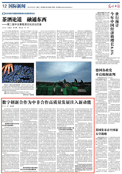 9月29日,《光明日报》刊发浙师大非洲研究院党总支书记王珩教授、非洲研究院科研助理柳喆勐撰写的文章《数字创新合作为中非合作高质量发展注入新动能》。本文系“研究阐释党的十九届五中全会精神国家社科基金重大项目〔21ZDA129〕”成果之一。
