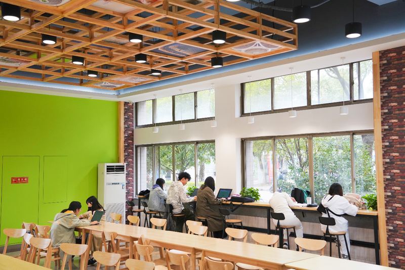 如今的杏一食堂也不再只是传统意义上单一的就餐场所,完成了向复合型空间的转变,成了最有氛围感的“图书馆”。