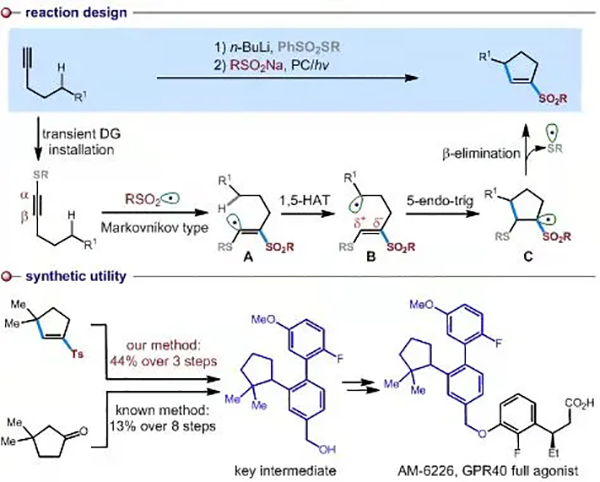朱钢国教授课题组在Angewandte Chemie上在线发表了题为“Photocatalytic Sulfonylcarbocyclization of Alkynes Using SEt as a Traceless Directing Group: Access to Cyclopentenes and Indenes”的研究论文。