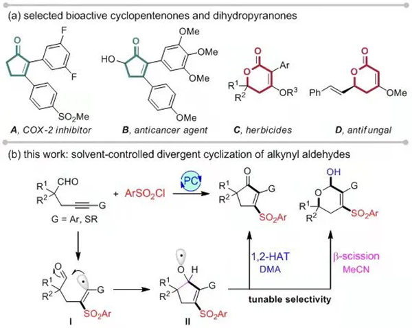 本工作采用烯基自由基对脂肪醛加成,利用烯烃对邻位自由基的稳定作用促进氧自由基II的1,2-HAT或β-断裂反应,实现了一个溶剂调控的可见光催化炔基醛的自由基加成/环化串联反应,能够选择性合成环戊烯酮或二氢吡喃酮,从而为相关药物和天然产物合成提供了有效手段。值得一提的是,本工作仅需改变溶剂就能实现产物选择性的调控,反应操作简单,应用前景良好。控制实验与南开大学薛小松课题组的理论计算结果表明:DMA为溶剂时,可以通过DMA参与的1,2-HAT选择性生成环戊烯酮;而MeCN为溶剂时,由于其参与的1,2-HAT能垒过高,则通过能垒更低的β-断裂、6-endo环化生成二氢吡喃酮。