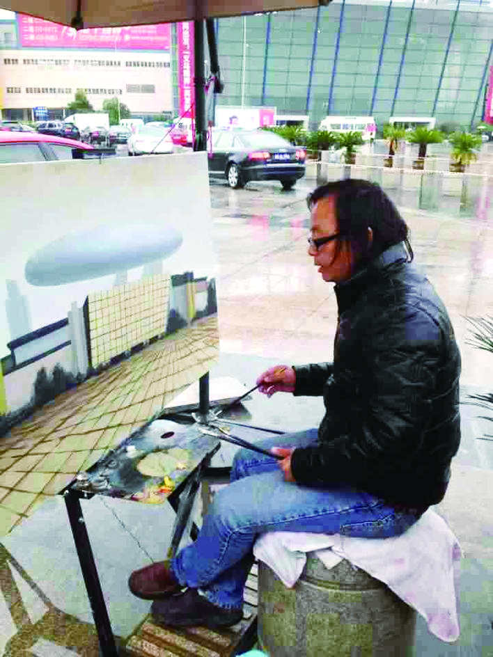 倘若时光推移至8年前,路过国际商贸城一区西大门的客商,经常能看到一个头戴鸭舌帽、手拿画笔,认真创作油画的人。