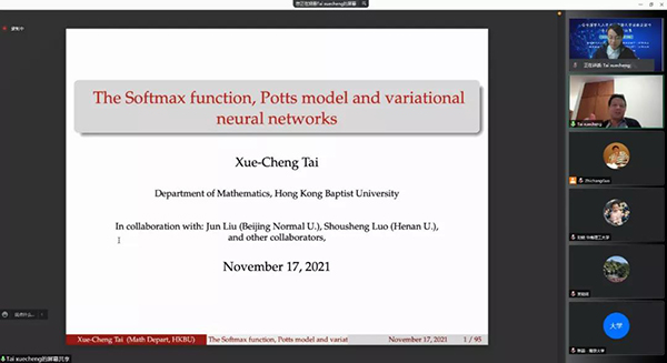 本次会议还邀请了著名医学人工智能算法专家、香港浸会大学的台雪成教授为大家做学术报告。台雪成在报告中介绍了变分模型和深度卷积神经网络有效结合的一些新进展和思路,并同与会专家就一些热点问题进行了详细的交流和讨论。
