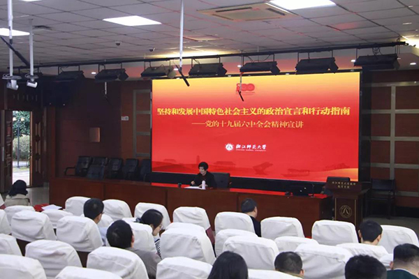 为深入学习贯彻落实全会精神,推动学院各项工作高质量发展,11月24日下午,浙江师范大学教师教育学院组织召开学习党的十九届六中全会精神宣讲报告会。教师教育学院党委书记查颖面向全体教职工作宣讲报告,从“百年奋斗”“经验启示”“学习践行”等三个维度进行深入解读。