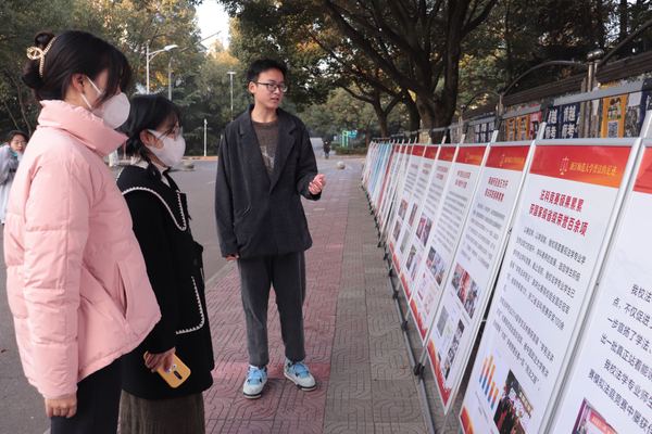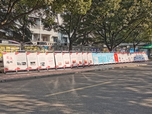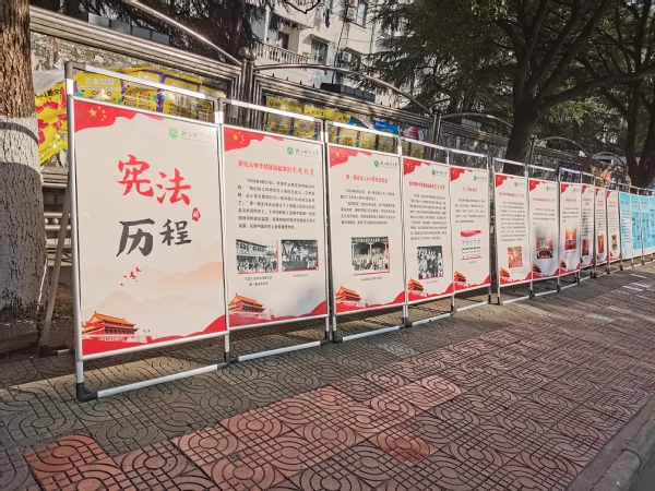 杏园主干道上,不少同学在宪法宣传的展板前驻足学习,法政学院的同学耐心细致地讲解着我国宪法的历程、监察法实施条例以及普法的足迹等内容。