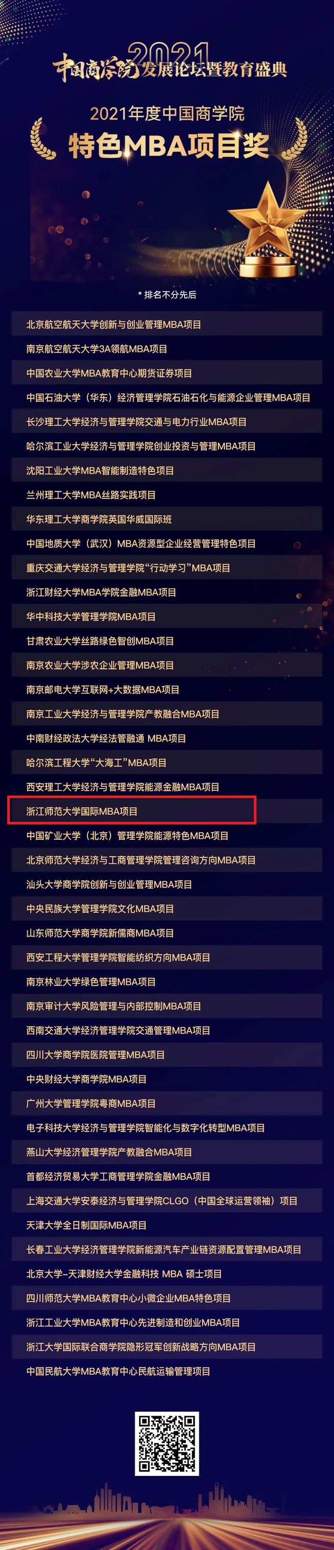 2021年12月10日,MBAChina与《经理人》杂志联合主办的“2021中国商学院发展论坛暨教育盛典”圆满落幕!浙江师范大学国际MBA项目荣获“2021年度中国商学院特色MBA项目”奖。
