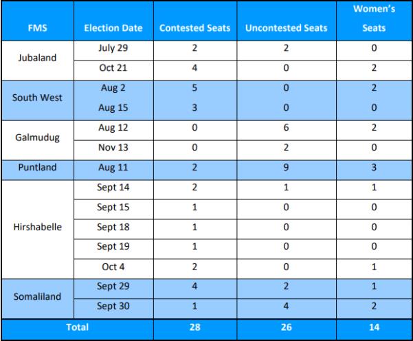 为了加快已经受到冲击的选举进程,索马里全国咨询委员会(National Consultative Council)于5月27日就间接选举达成相关协议,并就选举的关键数额达成谅解。按计划,索马里将在7月25日举行议会上院(Upper House)选举,8月10日至9月10日进行人民院选举。毫不意外的是,这一选举日程再度遭到推迟。直到8月22日,罗布尔总理和五个联邦成员州的领导人终于达成协议,并就上院和人民院的选举形式作出详细说明。