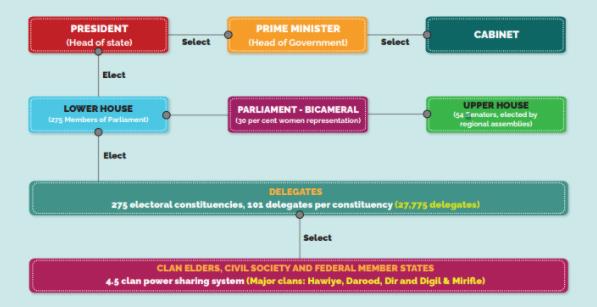 在2016-2017年,议会和总统选举的大致流程如下:先由氏族长老们推选出51名议会选举代表,再由这些选举代表选出14025人组成选举团,然后选举团的选民投票选出人民院的275名议员;上院54名议员则分别由各联邦成员州的议会选出,其中贾穆杜格、西南州、希尔谢贝利和朱巴兰各8个席位,邦特兰和索马里兰各11个席位;最后,由人民院和上院联合选举总统。[4]不过,索马里今年的议会选举做了部分调整:选举代表的推选数量由51人增至101人;相应地,选举团人数由14025名增加到27775名,每个成员州的投票站点也由一个改为两个;此外,今年还新增了几个委员会来审查核实参与投票的人员。