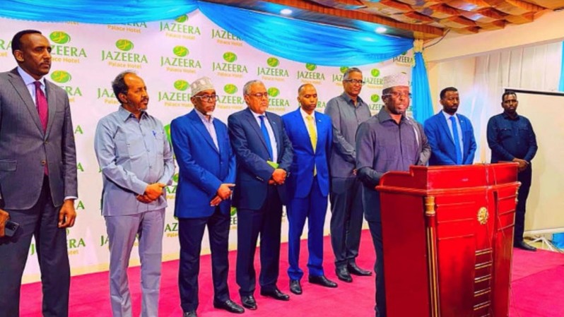 2021年12月12日,索马里总统候选人委员会在摩加迪沙发表声明,严厉抨击正在进行的人民院选举。图源:Garowe Online
