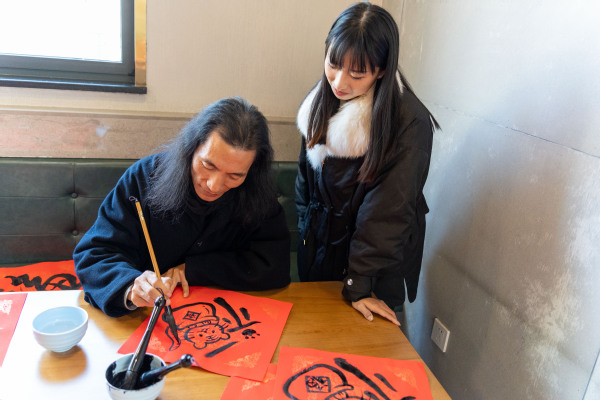 当天上午十点钟,书法家和师生志愿者便来到教工餐厅忙碌起来,随着红纸慢慢铺开,翰墨飘香。伴着冬日的暖阳,老师和学生们拿起毛笔,挥毫泼墨,饱含真情写下祝福,用心勾勒吉祥图案,或苍劲有力,或婉转绵延。一停一顿、一起一落之间,各种字体的福字和形态俏皮的吉祥虎便跃然纸上,引得现场老师频频称赞。