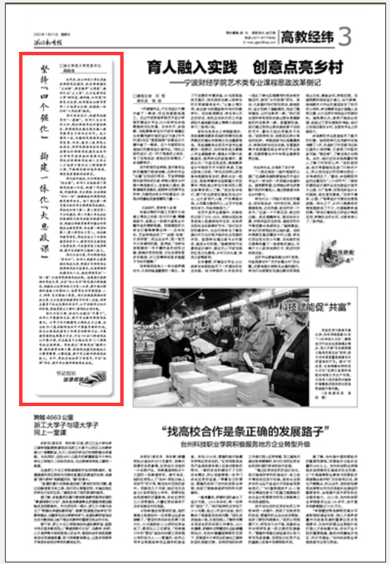 1月21日,《浙江教育报》刊发浙师大党委书记蒋国俊教授署名文章《坚持“四个强化” 构建一体化“大思政课”》,介绍了浙江师范大学构建一体化“大思政课”格局的经验做法。