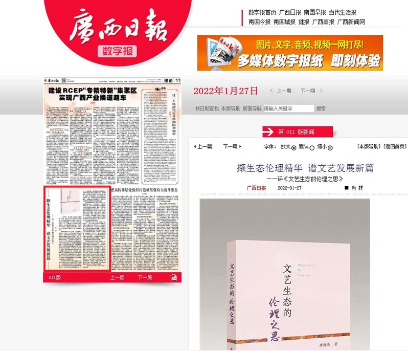 根据马克思主义文艺观,生态指向于主体的人与自然、与万物之间达到共生和谐状态。文艺来源于生活和实践,追求的就是绿色健康的生态良性发展。因此,生态思想为文艺领域研究提供了新的理论支撑和研究视域,二者具有天然的耦合性。2021年12月由广西师范大学出版社推出、广西艺术学院马克思主义学院唐海燕教授独著的《文艺生态的伦理之思》,敏锐地捕捉到了这一具有适用性和前瞻性的论题,以生态伦理为切入视角对“文艺生态”进行研究,得出了具有创新性和启示性的结论。该书以鞭辟入里的分析论述,全景呈现、深度阐释了生态伦理场域中文艺生态的内涵和外延、辨析和思考、前瞻和发展,是一部马克思主义文艺生态思想本土化时代化研究的力作,是基于生态伦理视域探索文艺生态构建的有益成果。其主要特点有: