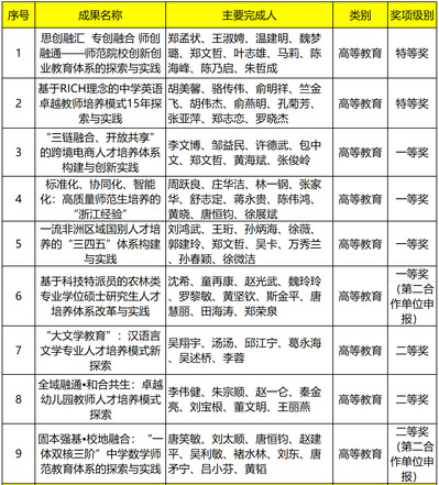 一直以来,浙江师范大学始终坚持立德树人根本任务,围绕创新创业教育、卓越师范生培养、产教融合、特色办学方面扎实推进教育教学改革,并高度重视高层次教学成果的培育与凝练,在省级教学成果奖项上实现新突破。高等教育教学成果奖中,《思创融汇 专创融合 师创融通——师范院校创新创业教育体系的探索与实践》发挥师范院校办学优势,经过10余年的探索与实践,通过优化“思创融汇”的大思政平台,构建“专创融合”的全矩阵体系,开拓“师创融通”的新师范格局,探索富有特色、卓有成效、具有重要影响力的师范院校创新创业教育体系,培养了一批“想创”“会创”“教创”的创新创业人才。《基于RICH理念的中学英语卓越教师培养模式15年探索与实践》以RICH理念为引领,通过“英语+师范”课程体系、研究性学习、大中学校协同育人,促进学生英语专业素养、人文素质与教师素养协调发展,实现英语教育与师范教育有机融合。《标准化、协同化、智能化:高质量师范生培养的“浙江经验”》遵循标准化、协同化、智能化的高质量师范生培养理念,建立以浙江师范大学为核心的省内师范生培养院校协同创新共同体,从省域层面实现高质量师范生培养的标准再造、机制创新、监控智治,形成了新时代高质量师范生培养的浙江经验。《“三链融合、开放共享”的跨境电商人才培养体系构建与创新实践》充分利用学校地处跨境电商发展高地浙江的优势,聚合跨境电商全产业链资源,构建实训实战平台、线上线下课程、实习就业对接、创新创业平台,促进培养链、产业链和创新链三链深度融合,为大学生提供了实训、就业、创业孵化全周期全要素支持。《一流非洲区域国别人才培养的“三四五”体系构建与实践》以非洲发展与中非合作重大问题为导向,确立“全球视野、非洲情怀、中国特色”课程理念,构建“三层贯通”的学科课程体系,建立 “课内外、校内外、国内外、行业内外”四维协同素质拓展体系,创立“学科建设为本体、智库服务为功用、媒体传播为手段、扎根非洲为前提,中非合作为路径”的“五位一体”教学实践体系,致力培养“中国的非洲通和非洲的中国通”。