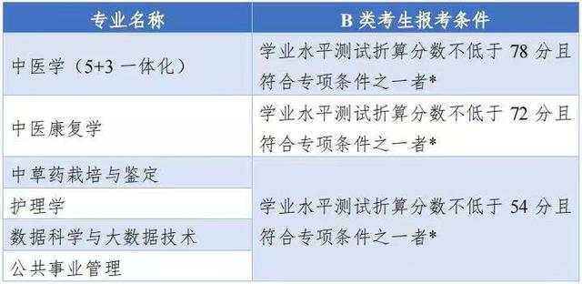 按上述基本条件,B类考生报考各专业的要求为: