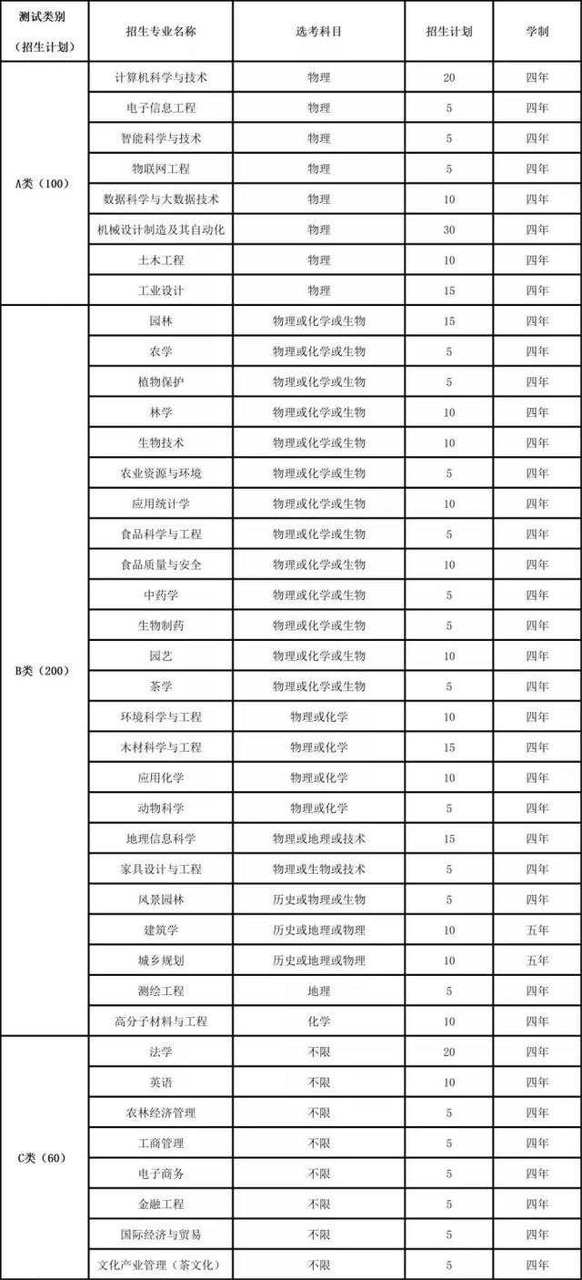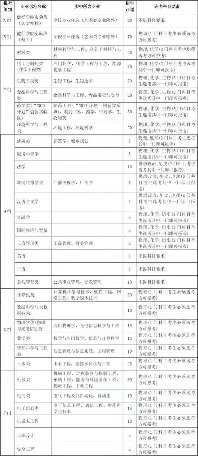 学校将招生专业分为A组、B组、C组、D组、E组和F组6个类别。考生只能选报其中一个专业组,不能兼报。具体报考专业组类别、专业类名称、包含专业、计划数及报考相关专业所需的选考科目要求如下表。