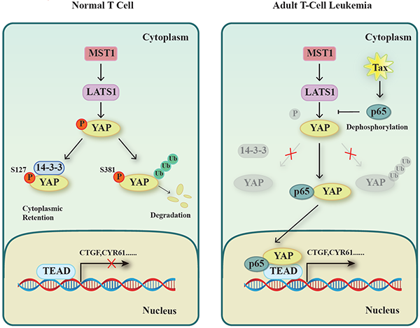 成人T细胞白血病(ATL)是由人类T细胞白血病1型病毒(HTLV-1)感染引起的恶性淋巴系统肿瘤。HTLV-1病毒通过调控与细胞增殖、转化相关的信号通路从而发挥其致癌功能。赵铁军课题组的研究首次发现Hippo信号通路在成人T细胞白血病ATL中受到异常调控。Hippo通路关键蛋白YAP在 HTLV-1病毒感染细胞及ATL临床病人中持续高表达,且YAP转录活性显著增强。机制研究发现,HTLV-1编码的病毒蛋白Tax通过NF-kB/p65途径激活YAP蛋白功能。此外,研究发现p65阻遏了YAP和LATS1之间的相互作用,从而抑制YAP磷酸化,进而抑制YAP的泛素化降解,导致了YAP在细胞核内富集。最后,异常活化的YAP蛋白促进了ATL白血病细胞的恶性增殖,激活了移植瘤小鼠的肿瘤形成。