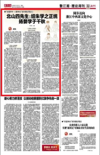 更为难得的是,北山四先生关心百姓,心系国家,危亡之际,挺身而出,真正做到了知行合一,成就了仁人君子的伟岸人格,他们是“以文化人”的典范。何基以身践道的君子人格,王柏、金履祥质疑、创新的精神和经世济民的情怀,金履祥、许谦终身不仕元朝的民族气节和爱国情怀,都成为金华厚重的文化积淀与宝贵的精神财富,融入了金华人的精神血脉之中,成为“扛旗争先、崛起浙中”的精神力量,激励着我们在推动金华文化建设再上新台阶的进程中奋力前行。