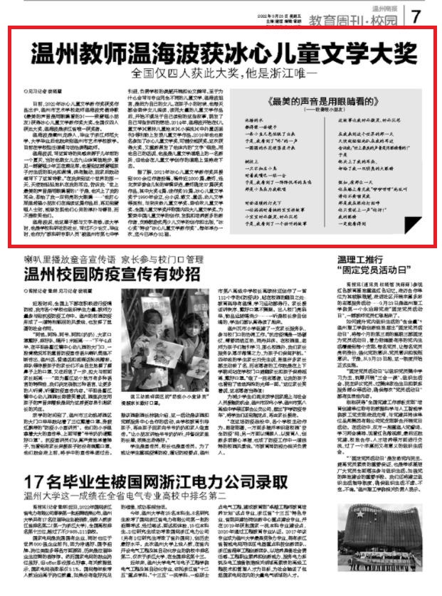 日前,2022年冰心儿童文学新作奖获奖作品出炉,温州市艺术学校老师温海波凭借诗歌《最美的声音是用眼睛看的》(——致聋哑小朋友)获得冰心儿童文学新作奖大奖。全国仅四人获此大奖,温海波是浙江省唯一获奖者。