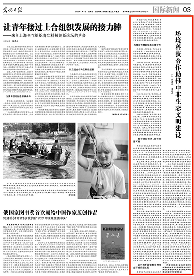 6月5日,《光明日报》刊发浙江师范大学地理与环境科学学院张建珍教授、研究生梁晓雨撰写的文章《环境科技合作助推中非生态文明建设》。文章系浙江省习近平新时代中国特色社会主义思想研究中心浙江师范大学基地研究成果。