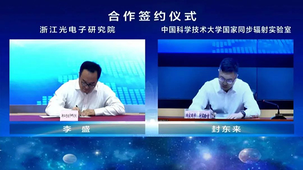 浙江光电子研究院负责人李盛与封东来代表双方云签约《浙江光电子研究院中国科学技术大学国家同步辐射实验室合作协议》。