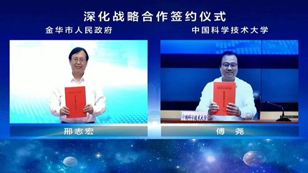 签约仪式采用现场签约与云签约相结合的方式进行。傅尧与邢志宏代表双方云签约《中国科学技术大学金华市人民政府深化战略合作协议书》。