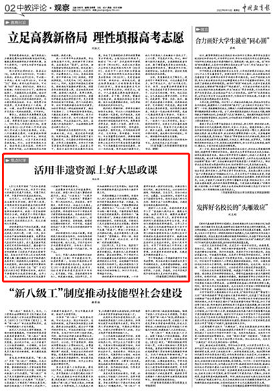 6月10日,“文化和自然遗产日”前夕,《中国教育报》刊发浙师大美术学院赵红华副教授文章《活用非遗资源上好大思政课》。文章指出,一个个非遗项目,就是一本本内容鲜活的教科书,就是一堂堂地域鲜明的乡土课。中小学校要挖掘好非遗项目中的思政资源,用当地非遗文化滋养当代青少年的精神成长,发挥非遗培根铸魂、启智润心的独特作用,引领青少年树立正确的世界观、人生观、价值观,立志肩负起实现中华民族伟大复兴的历史重任。