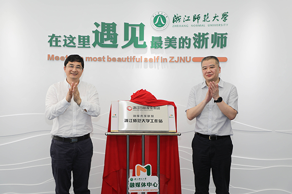 程为民、朱坚共同为“浙江日报报业集团融媒共享联盟浙江师范大学工作站”揭牌。