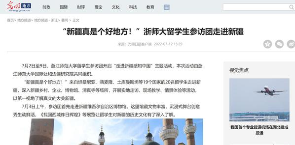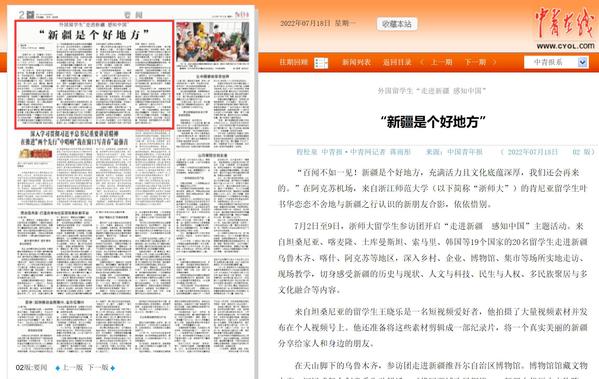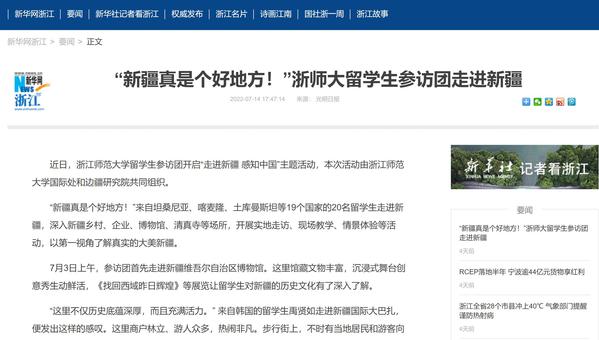 截止日前,浙师大留学生“走进新疆 感知中国”活动引发国内媒体广泛报道:《人民日报》《光明日报》《中国青年报》、新华网、光明网、中新社、新疆日报、新疆卫视等重磅媒体纷纷报道。同时,活动在海外媒体平台产生持续影响,中国国际电视台CGTN英文频道、CGTN法语频道等连线参访团留学生,向大家讲述自己眼中真实美丽的新疆。
