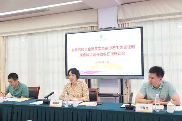 7月19日,省委宣传部意识形态工作责任制督查室二级巡视员施丽琴一行来到浙江师范大学开展高质量全面落实意识形态责任制综合试点情况调研,浙师大党委副书记朱坚出席座谈会并作意识形态工作汇报。