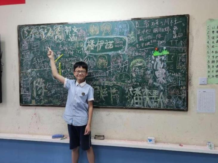7月18日,在金华市荣光学校三楼的一间教室里,两名小学生抓住不放,还不停地请求。其中一名叫陈铭禹的同学还跑过去指着黑板上密密麻麻的签名,自豪地说,瞧,那是我的名字,那一黑板的签名签的是我们同学的名字!另一名同学应晨逸则指着手里一叠纸片说,“看,这是我搜集的小老师们的名片。”